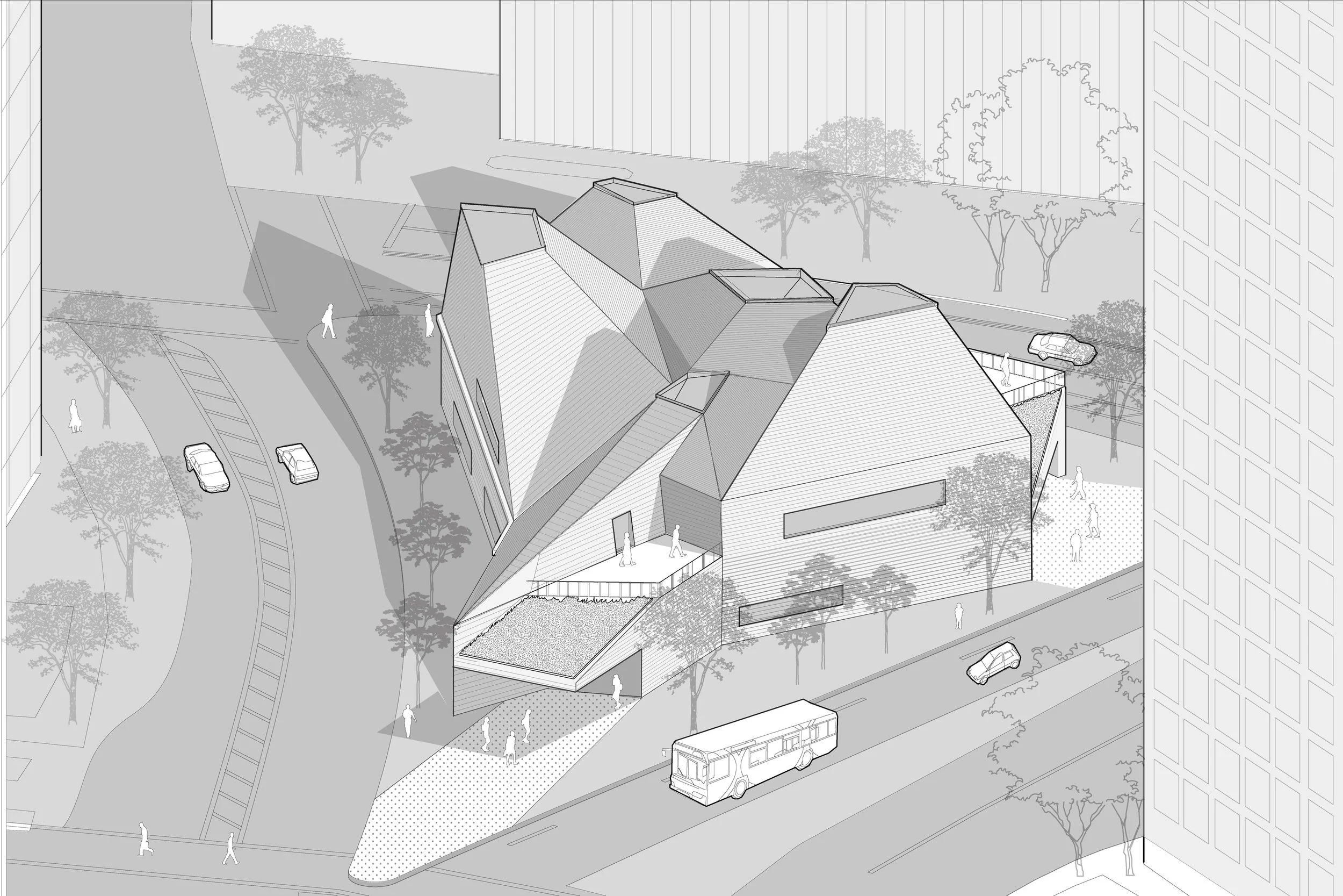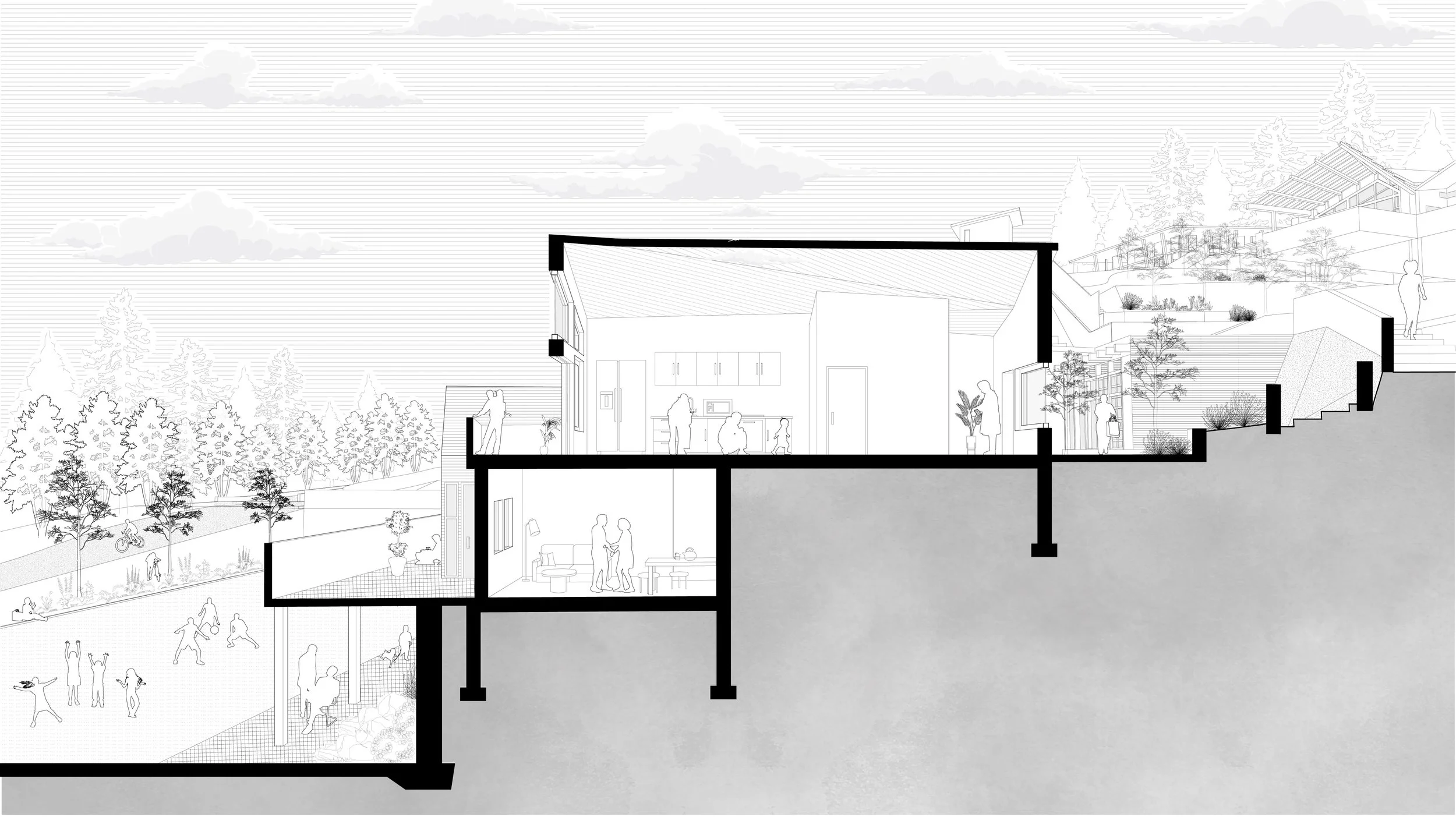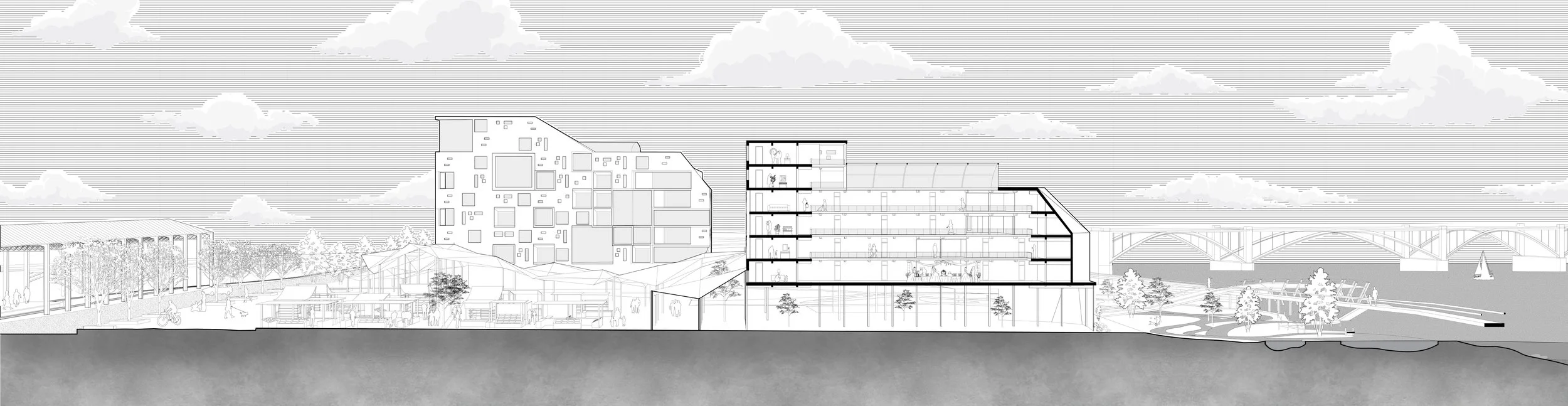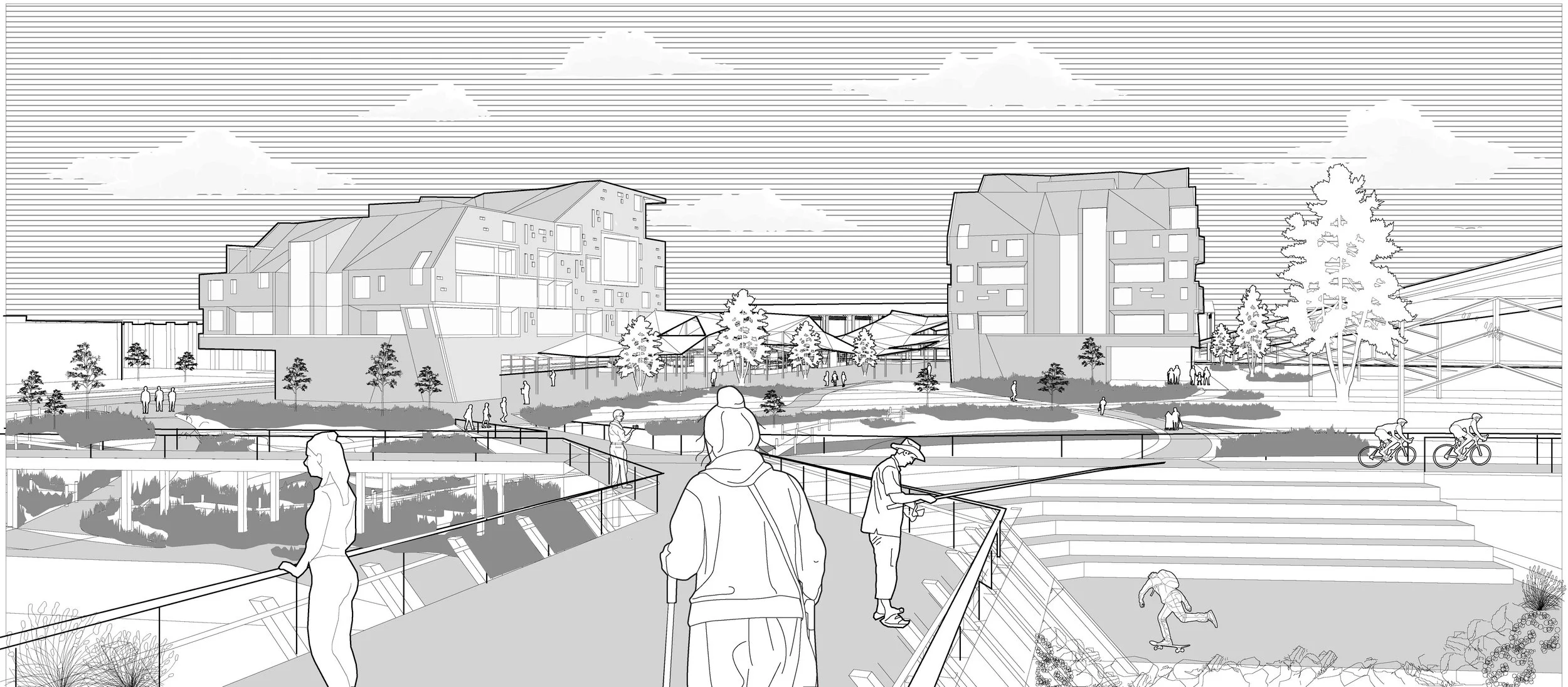 This project spans three distinct sites, each designed to not only enhance the city’s aesthetic appeal but also foster a sense of environmental responsibility and communal well-being. A reimagined rail line weaves through these three sites, acting as the connective thread that ties the urban fabric together. Efficient and sustainable, the rail line facilitates easy access between the agricultural community, waterfront housing units, and the downtown gateway station.